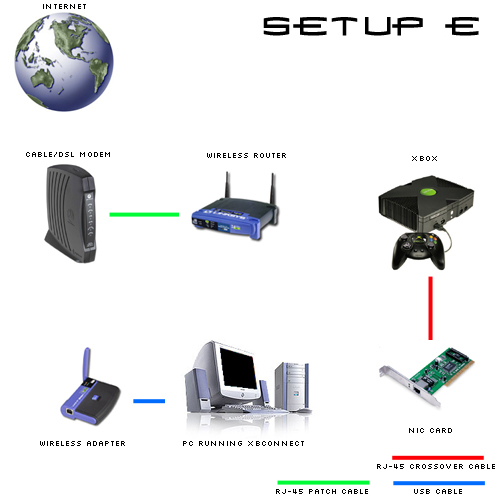 NOTE: A Crossover Cable is only needed if you are connecting the Xbox directly to a NIC card. This type of network setup also requires the use of WinICS (tutorial found here) or a program such as WinRoute© (downloadable from the world wide web). Consult the manual for specific instructions on how to set this up.